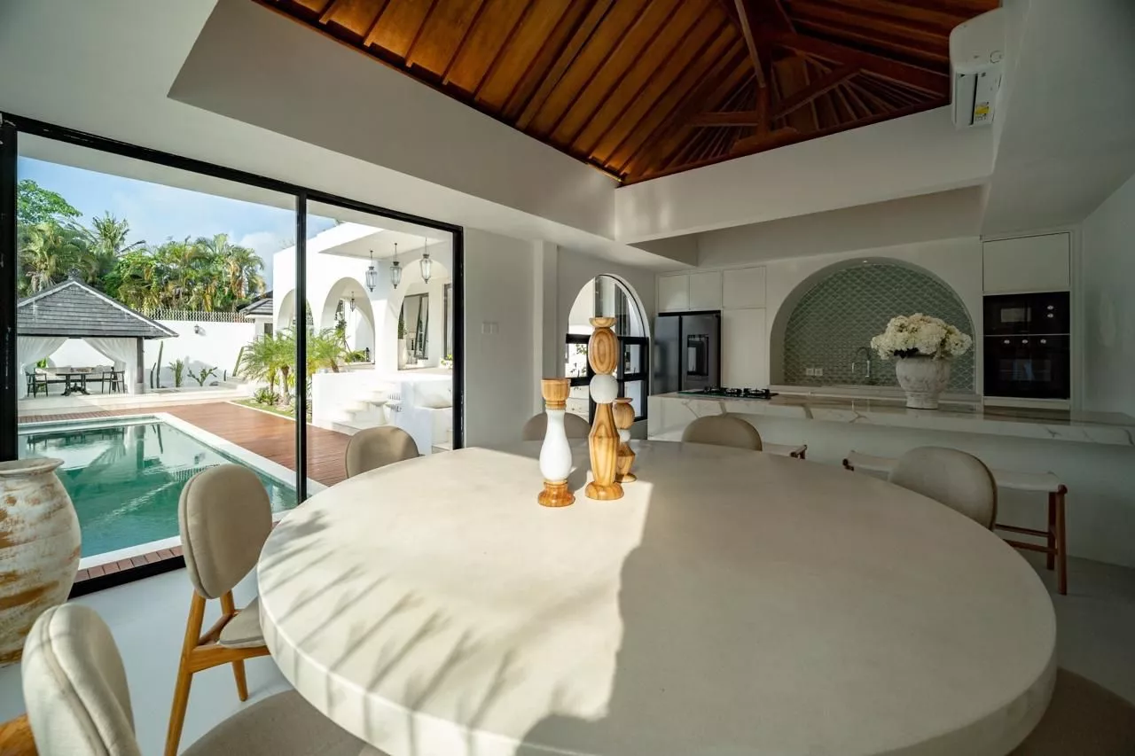 Located in the prime Berawa area of Canggu, this modern Mediterranean-style villa offers an elegant tropical lifestyle surrounded by popular cafes, restaurants, and beach destinations. Set on 528 sqm of land with a 555 sqm building size, this property is ideal for both private living and high-return investment.